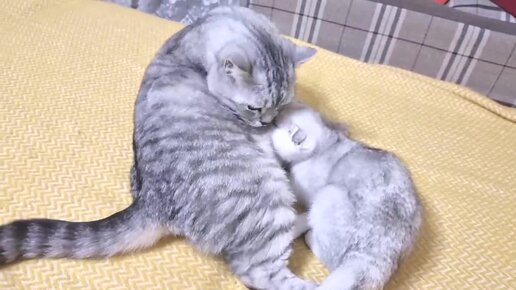 Котенок перепутал маму кошку с папой котом 😂 Так мило папа кот ухаживает за своим котенком