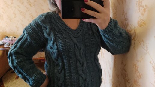 Готовая работа. Джемпер с крупными косами и v-образной горловиной