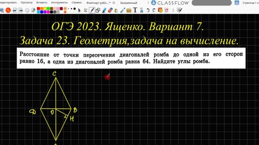 По диагонали и расстоянию, найти углы ромба. ОГЭ 2023, Ященко, вариант 7, задача 23.