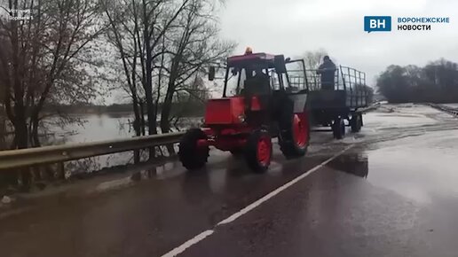 Из-за паводка тракторист возит жителей Воронежской области через затопленный мост.