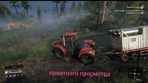Мощной тягой Кировец к7 тянет большой генератор для лесопилки...(snowrunner симулятор)