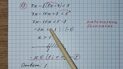 13) Решите неравенство 7х-2(5х-4) < 5. ОГЭ по математике 2023. Решу огэ. Канал Математика бесплатно.