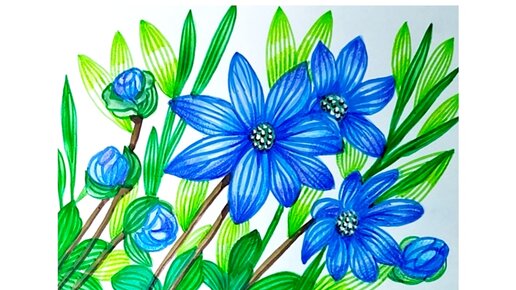 🍀💙🍀Голубые цветы. Гуашь, фломастер, карандаш.🍀💙🍀