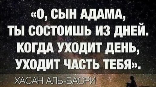 Всевышний Аллах говорит: «О, сын Адама, ты состоишь из дней. Когда уходит день, уходит часть тебя».