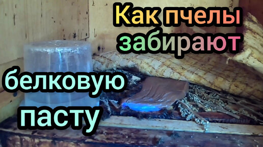 Как пчёлы забирают белковую пасту приготовленную из совой муки, сухого молока и пивных дрожжей.