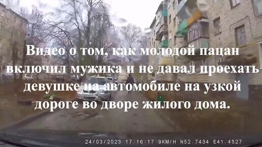 Видео о том, как молодой пацан включил мужика и не давал проехать девушке на автомобиле на узкой дороге во дворе жилого дома.