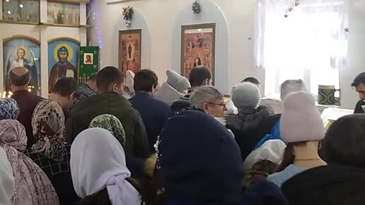 Батюшка кадит в заполненном храме.