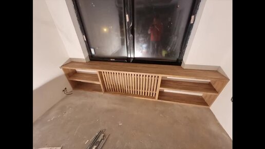 Деревянный подоконник из массива с полками и экраном на батарею на заказ.