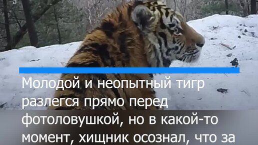 Молодой амурский тигр внезапно осознал, что за ним “наблюдает” фотоловушка