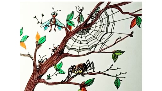 🕸🕷🕸Паучишка и мошкара. Рисунок маркерами. 🦟🦋🦟Иллюстрация к сказке. 🌿🍀🌿