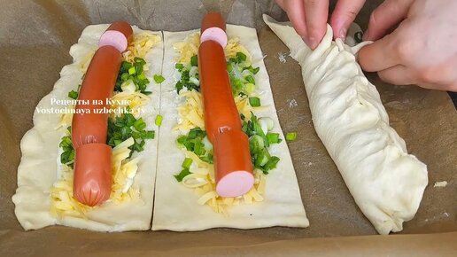 Готовлю рулетики из слоеного теста с сосисками, дети восторге