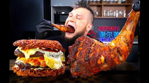 БУРГЕР ИЗ ЛАПШИ, ЗАПЕЧЕНЫЕ НОЖКИ, ASMR MUKBANG, АСМР МУКБАНГ, 먹방, 大食い, たべる,谢尔盖