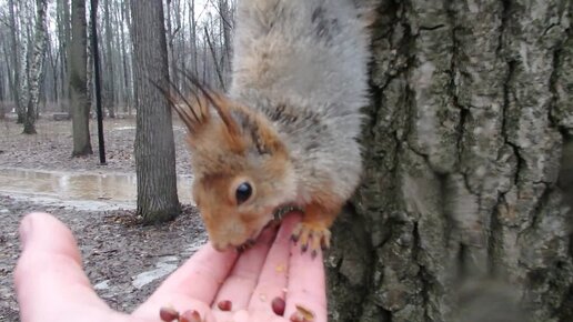 Кормлю белок в дождь