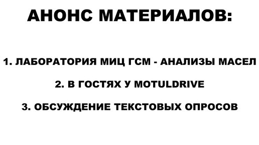 АНОНС МАТЕРИАЛОВ: ЛАБОРАТОРИЯ МИЦ ГСМ АНАЛИЗЫ МАСЕЛ, В ГОСТЯХ У MOTULDRIVE, ОБСУЖДЕНИЕ ОПРОСОВ.
