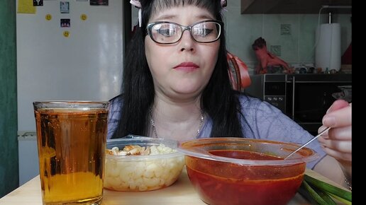 Мукбанг | Борщ и макароны с курицей,яблочный сок. Столовский обэд😁 . Обжорчик