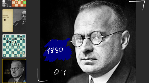 Нимцович (черные) закрывает гештальт, изящно обыгрывая в своей защите Боголюбова, не оставляя камня на камне крепости Ефима Дмитриевича, 0-1