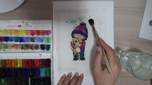 Вышивка крестиком и акварель. Мальчик с собачкой
