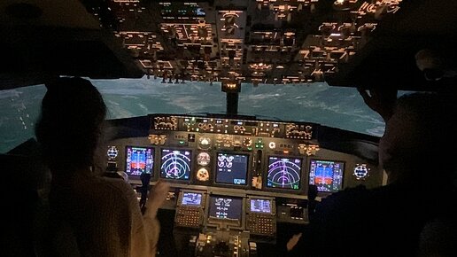 Дочь учится летать на авиатренажёре, пилот-инструктор рядом