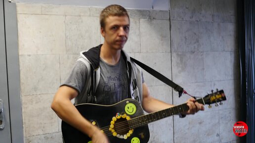 В подземном переходе. Уличные музыканты играют и поют в переходе.