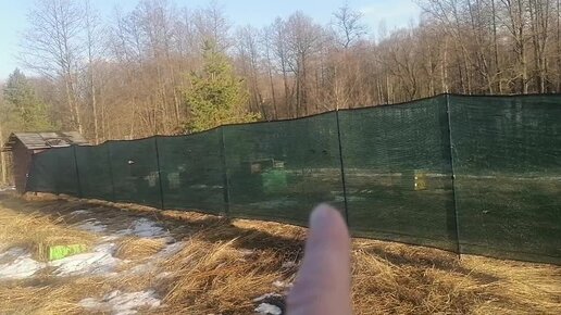 Забор из сетки строительной фасадной для ограничения лёта пчёл с разведенческой пасеки.