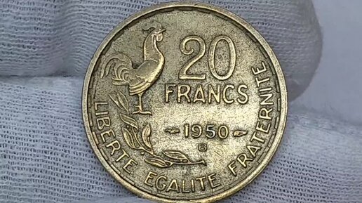 20 франков 1950 года. Галльский петух. Монетный двор Бомон-ле-Роже. Франция