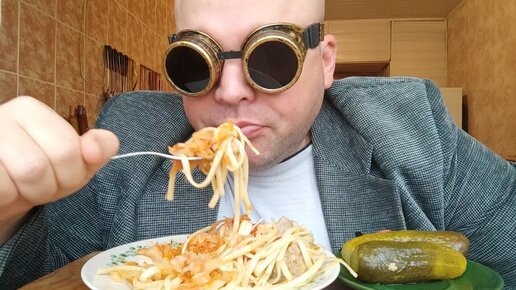 ОБЖОР тушеная капуста и спагетти с мясом/мукбанг с утречка
