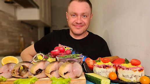 МУКБАНГ. ОБЖОР. СКУМБРИЯ ХОЛОДНОГО КОПЧЕНИЯ, САЛАТ СЕЛЁДКА ПОД ШУБОЙ, КАРТОХА, ОВОЩИ. АСМР.