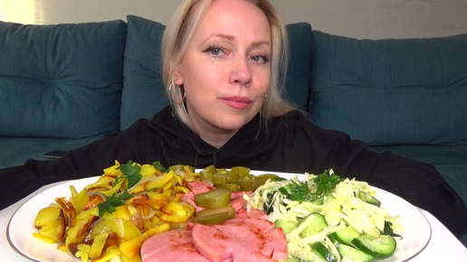 Жареная картошка с колбасой, огурцы бочковые, салат капустный. мукбанг.
