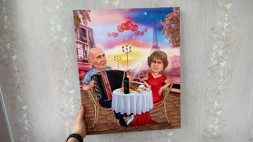 Шарж по фото 55х70см. "Свидание в Париже". Подарок родителям на годовщину свадьбы