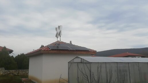 Альтернативные источники энергии в деревне Осеново. Маленький ветрогенератор и солнечные батареи на крыше.