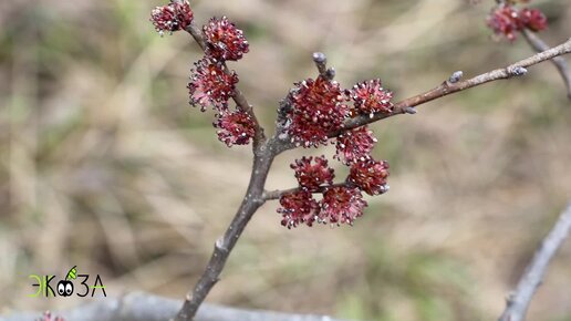 Вяз шершавый цветёт. И цветы вяза гладкого для сравнения. Поёт певчий дрозд