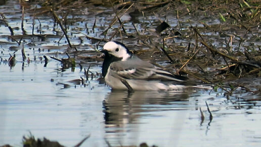 Трясогузка умывается, а ее подружки пришли посмотреть, зачем она в луже валяется