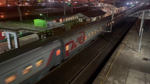 Электровоз ЭП2К с поездом Москва-Киров в вечерних огнях станции Болшево.
