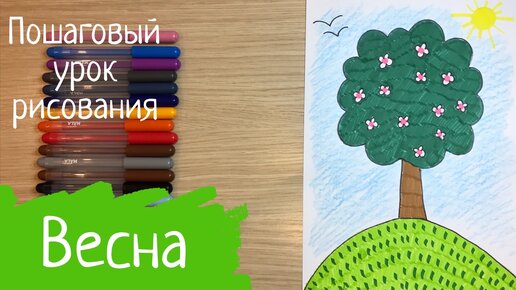 Рисунок для детей весна рисовать легко просто пошаговый рисунок Весенний пейзаж легкий дерево весной. Карандаши и краски.