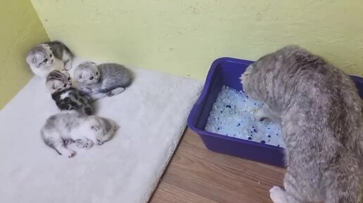 Мама кошка учит котят кушать сухой корм и ходить в туалет с наполнителем силикагель