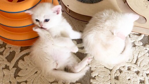 Три белых котёнка кошки Кайли едят вместе вкусную рыбку, потом отдыхают.