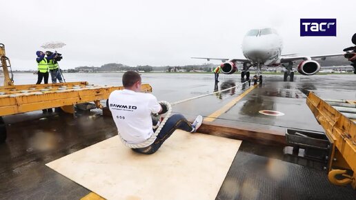 Атлет Денис Вовк установил мировой рекорд, буксируя самолет Sukhoi SuperJet 100 авиакомпании "Россия"