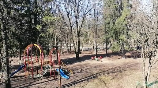 Небольшой сквер сзади дома. Кормушка для птиц. Детская площадка и куча мусора. Московская область