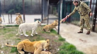 Вот так Олег Зубков приучает молодых львов БРАТЬ МЯСО из его рук?