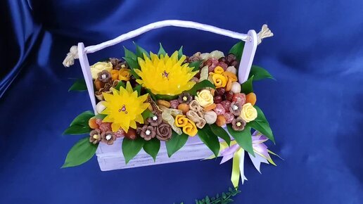 Сухофруктовый бокс с ярко- жёлтой хризантемой из папайи