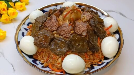 Настояшие узбекские плов с виноградными листьями. Узбекский плов из Девзиры с голубыми из консервированного виноградного листа
