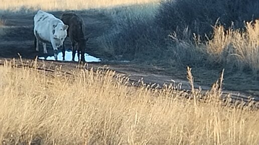 Корова с бычком на прогулке, под охраной собаки