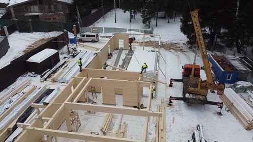 Возведение стен дома из клееного бруса с высоты птичьего полета