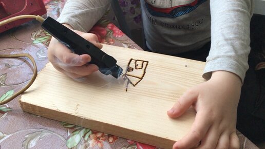 Принес сыну выжигатель. Учится выжигать на деревянных досочках