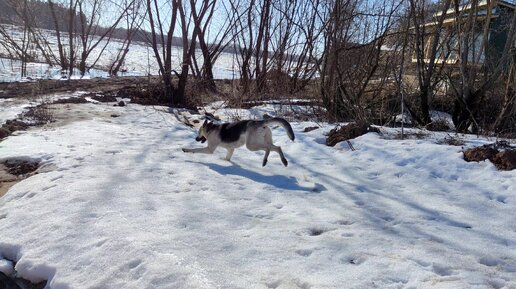 Идем с Дариком к реке, я радуюсь ледоходу, а он остаткам снега
