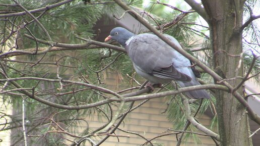 Прилетела вторая смена на кормушку для птиц. Лесной голубь вяхирь заглядывает в сад