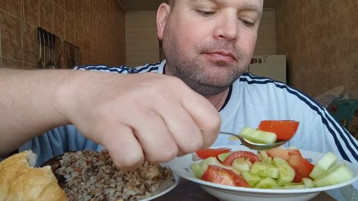 ОБЖОР пирожок с печенью и гречка с шашлыком/мукбанг салат из овощей