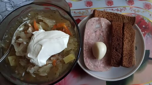 Простой и Вкусный ПП обед: Щи постные из квашеной капусты со сметаной и сухой зеленью с сухариками,чеснок и ЗЕЛЬЦ. Все очень просто,бюджетно
