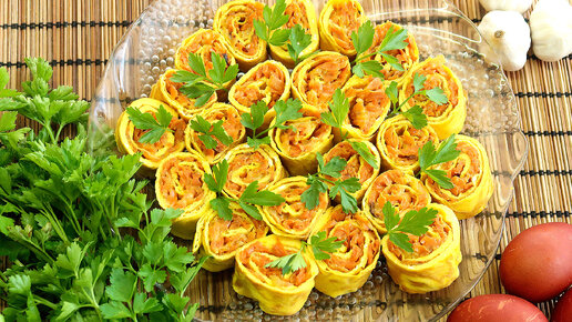 Рулетики из яичных блинчиков с морковно-сырной начинкой.