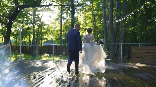 Красивая свадьба в начале лета на красивой зеленой площадке. Цвета оформления: белый и голубой.